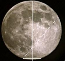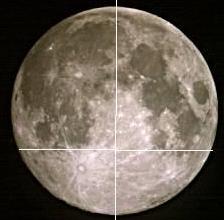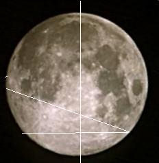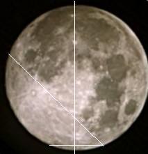 The moon as it appeared at 20:05 on July 29, 2004. Note that the Landmarks have shifted almost 60 degrees from their postions in early July, with the Buzzards Beak now at the 2:00 position, the Buzzards Eye at the 12:30 position and the Crater Tycho at the 5:00 position. This represents a nearly 60o shift to the counter clockwise in roughly 27 days.