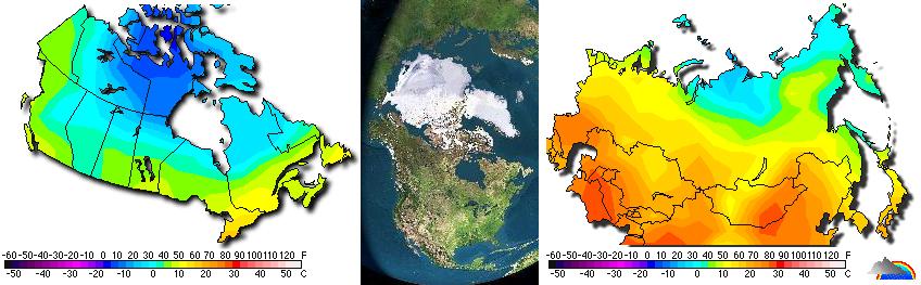 The Earth view from the sun via satellite http://www.fourmilab.ch/cgi-bin/uncgi/Earth (center) shows by snowcover what the http://www.weatherunderground.com maps show, that Siberia, equivalent to northern Canada and Norway in latitude, is too warm, the cold offset around the N Pole.