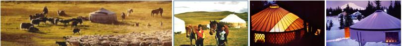 The Yurt, used by the Mongols sufficient against the bitter winter cold there, highly portable, made from sticks and rope and canvas or felt or plastic sheeting. Photos from the Pacific Yurt site showing Mongol use at left, and modern versions at right.