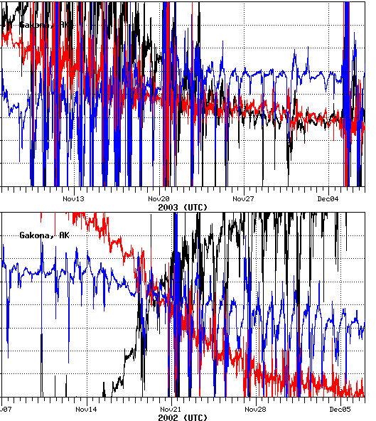 Only the pull toward the S Pole (black) differs during November, a month when erratic swings of the compass were noted.