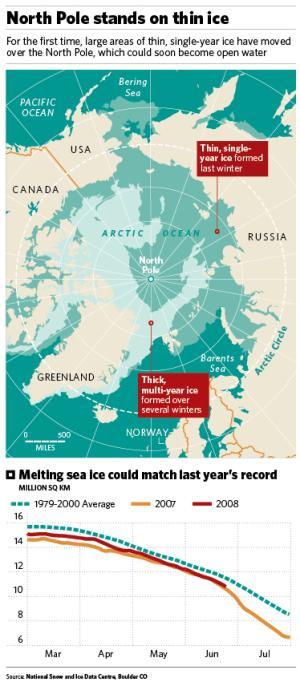 No ice at the North Pole [Jun 27] http://www.independent.co.uk/environment/climate-change/ It seems unthinkable, but for the first time in human history, ice is on course to disappear entirely from the North Pole this year. The disappearance of the Arctic sea ice, making it possible to reach the Pole sailing in a boat through open water, would be one of the most dramatic - and worrying - examples of the impact of global warming on the planet. Scientists say the ice at 90 degrees north may well have melted away by the summer. Each summer the sea ice melts before reforming again during the long Arctic winter but the loss of sea ice last year was so extensive that much of the Arctic Ocean became open water, with the water-ice boundary coming just 700 miles away from the North Pole.