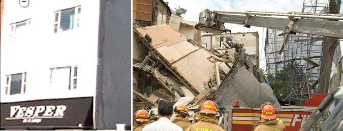 [Jun 21] http://www.nypost.com/seven/06212009/news/regionalnews/ A four-story Brooklyn building recently cited for a long crack in its facade dramatically collapsed this afternoon, stunning onlookers and spurring the evacuation of five nearby buildings. The building's owner, William Sang, showed up at the scene right before the collapse after a tenant called to report falling items in his apartments. The building's upper three floors contained apartments housing five tenants in all, while the ground floor had been occupied by a popular watering hole, Vesper Bar and Lounge. Sang was quick to blame the owner of the adjacent building, pointing out that right before the collapse yesterday there had workers doing repairs on the other building's façade. .However, the Building Department inspectors had written up Sang's building on May 1 for shaking and a crack measuring one-half inch to one-inch that ran from the first to third floor. The crack's been there for 10 years. The building has been shaking for past six months.