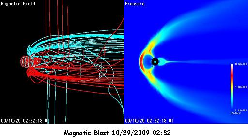 Recently, the magnetic fields has appeared twisted, with the positive outflow immediately going south and the intake, the negative flow, coming down from the north instead of up from the south. What would cause that? Within a 24 hour period from October 28-29 the field went from a normal appearance, to showing that a magneton blast was occurring, to showing a twisted magnetic field.