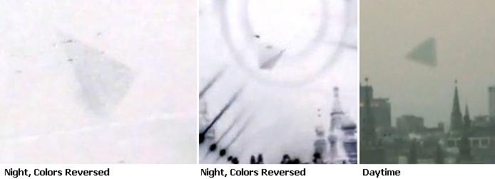 Daytime view http://www.youtube.com/watch?v=c49CAhRSoz4 night time view http://www.youtube.com/watch?v=tD4sxqiP3Ic on December 9, 2009 [and from another] Just so everyone knows. It is not a balloon! Nothing but nothing ever is suspended over or flies over the Kremlin. Period. It don't happen. I have been there many times. I sell aircraft in Russia and I know the rules. Putin cannot even helicopter to the airport from the Kremlin. [and from another] http://www.youtube.com/watch?v=xuanP2P41_I One problem with hologram theory..holograms don't reflect light, this object does as well as being shaded properly from the ground lights. [and from another] http://www.godlikeproductions.com/forum1/message941220/pg1 I'm a master of Maya, Softimage, After Effects and such. There is no way to do that using all those programs mentioned above. I've spent hours trying and it is impossible. I gave up! First of all, the footage is taken from the inside of a moving car and through the glass. Also, you would need to mask electrical cables as on 0:10 and that is crazy to do. There are many other aspects that would require something extraordinary to accomplish. Street light reflections are very dificult to mask as well. I've downloaded the vido to play it frame by frame and and all I can say is: Wow! Folks, tt is real as it gets! [and from another] It's a tetrahedron by the way-not a pyramid. [and from another] After watching the video over and over again. I can say that a tethered blimp is out of the question. If it were a blimp or balloon there should be a constant and permanent axis of rotation. In this case a cable from the roof to the object. But, and here it's the big but (no pun intended) the object is rotating freely. There is no fixed axis on it.