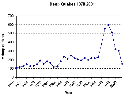 A Troubled Times member shows the exponential increase in deep quakes down to the 500 km level since 1994, using the database provided by a private organization known as The Council of the National Seismic System, working out of Berkeley, CA,which provide earthquake data and answers questions at their web site.