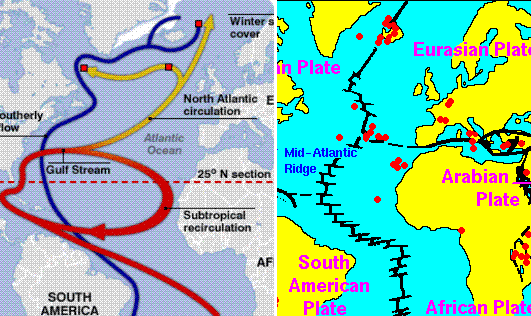 Of course the northern Atlantic Rift is most vulnerable at the Azores, where three plates touch and movement in any one of them destabilizes the rift. Africa is tugging to roll to the East, and drop, and will do so before the European tsunami occurs. This makes the separation of the N American Plate from the Eurasian Plate at the Azores and upward quite vulnerable. We have stated that the Atlantic Gulf Stream will carry the tsunami primarily against the coast of the UK, so the major rip point would occur slightly south of the UK in the center of the Atlantic. The top of the rip will be west of Paris. The rip will primarily occur where the hot spots along the Atlantic Rift indicate weakness in the crust, and down to where the African Plate has already pulled away from an attachment to the American plates. Iceland will be spared during the 7 of 10 scenarios.
