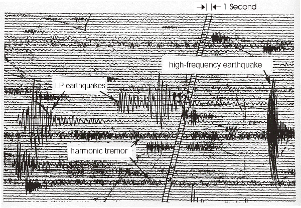 Harmonic tremor is a slow steady wave, or periodic pulse, that looks similar to a seismograph signature though with distinct differences. Long period events are similar to harmonic tremor, but with an even slower waveform. Harmonic tremor is not caused by an earthquake, but is caused by the movement of magma or superheated water within the volcano. Harmonic tremor is a signature that often portends a pending volcanic eruption.