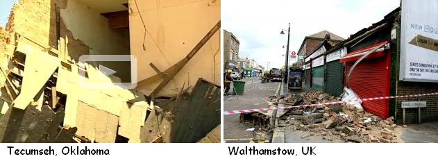 Buildings collapsed within a week of each other in Tecumseh, Oklahoma, in Walthamstrow in the UK, in Waterloo, Iowa, and in Bristol, Pennsylvania. There was no ostensible cause for collapse. The building in Waterloo had stood for 100 years or so. What would cause this building to suddenly decide to collapse? The Zetas have stated that land near river bottoms is subject to being pulled apart and becoming thin, and is in fact a river bottom because it has dropped, in relationship to nearby land, lacking the support that thick rock layers provide. The town or Walthamstrow is in fact between a river and a marshy area. Waterloo has a river running through it. And certainly a town in north Philadelphia has a river nearby.