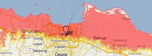 Jakarta's elevation is close to sea level. This map shows what would occur to the region with a loss of