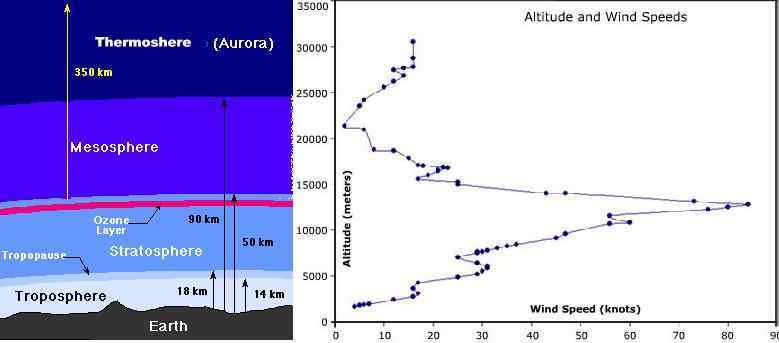 Until the atmosphere rebuilds, after the pole shift, each of the atmosphere layers will be compressed, having less depth, though each of the layers will still be present. The troposphere will thus be closer to the ground than the 14 kilometers at present, and in step with these compressed or shallow layers, the uptick in wind speed as the troposphere is approached will be found sooner. Estimate the layers to be cut in half, for your calculations.