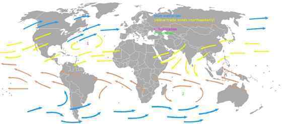In the deserts map, I've noticed that the prevailing wind patterns are unusual. Although the prevailing wind direction at the equator is the same as the standard prevailing wind maps of today http://www.emc.maricopa.edu/faculty/farabee/BIOBK/deserts.gif, East- to-West, the arching or curling backwards of 180 degrees in a West-to-East direction is a new factor in the prevailing wind directions. Additionally, the movement of air from the equator seems to move in a South-Westerly direction as opposed to the standard North-East trade winds. Are these new patterns due to a rotational direction change from East-to-West in the opposite direction after the Pole-shift? Or are they due to new land mass geography placement? Or perhaps is there some factor that is not mentioned. Could you ask the Zetas to comment on this please? [and from another] http://geography.about.com/od/physicalgeography/a/coriolis.htm The main cause of the Coriolis effect is the earth's rotation. As the earth spins in a counter-clockwise direction on its axis anything flying or flowing over a long distance above its surface is deflected. The direction of deflection from the Coriolis effect depends on the object's position on Earth. In the Northern Hemisphere, objects deflect to the right while in the Southern Hemisphere they deflect to the left. [and from another] http://en.wikipedia.org/wiki/Trade_wind The trade winds (also called trades) are the prevailing pattern of easterly surface winds found in the tropics, within the lower portion of the Earth's atmosphere, in the lower section of the troposphere near the Earth's equator. The trade winds blow predominantly from the northeast in the Northern Hemisphere and from the southeast in the Southern Hemisphere.