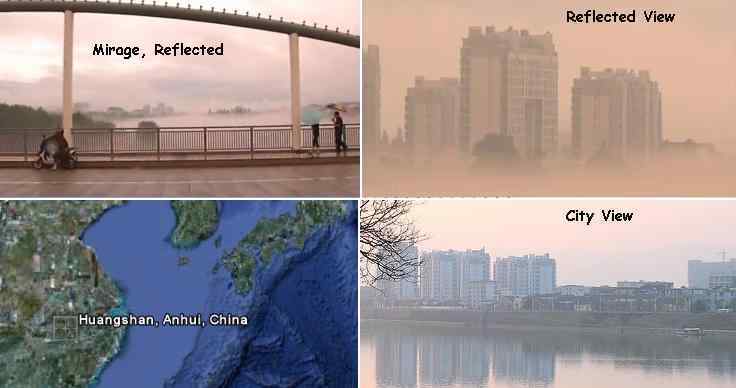 Is this another China Mirage of a hologram from a UFO? Is this another warning for flooding by the tectonic plates movements in the area and the poleshift? Huangshan City, Anhui Province, East China http://www.youtube.com/watch?v=dsMmef04qGs&feature=youtu.be [and from another] http://newscontent.cctv.com/news.jsp?fileId=112031 Amazing mirage appeared on Thursday at dusk at the Tunxi section of the Xin'an River in Huangshan City, east China's Anhui Province, when continuous pouring rain had just stopped. In the thin mist above the river were spectacular images of mountains, buildings and trees, which seemed to be floating on the river. The phenomenon began at about 17:00 p.m. local time, attracting a large number of people, who paused to watch the ethereal scene. [and from another] http://en.wikipedia.org/wiki/Mirage Cold air is denser than warm air and has therefore a greater refractive index. In the case where the air near the ground is cooler than that higher up, the light rays curve downward, producing a "superior image".