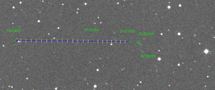 - I have made marker points between the coordinates for each day in between. I used linear projection. Remember that there are 24 hours in a day and the images were taken on Jan 10, 6:54:41 AM UTC over the period of 54 minutes. I used the DSS2 Fits file because it has the coordinate set in the file.