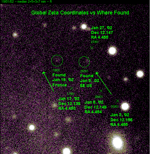 there will be an offset from the Global Coordinates. Below is an image from Pierre, how took an infrared image on Jan 19, 2002, and identified on his image where Planet X was found at Haute-Province Observatory in France on Jan 19, 2002 compared to the Jan 5, 2002 image taken from the East Coast of the US (presumed to be the SE US), and thense compared to the Global Coordinates given by the Zetas for various dates. There is an offset in both cases, and the offset differs.