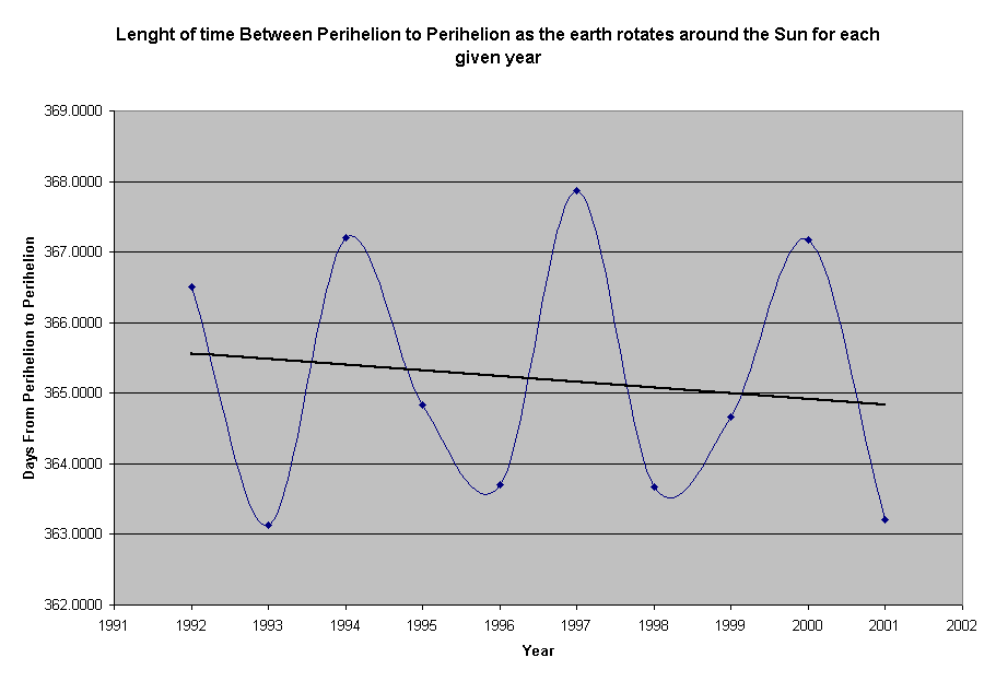 I then thought about finding some data on the earths rotation around the sun and plotting it to see if it would show the same result. I found the Navy Data on this, and plotted the time between Perihelion date and time each year. Perihelion is the point of closest approach to the sun as was reported only to the nearest hour. This point of closest approach to my understanding is due to the resulting gravitational forces of all planets, asteroids and stars. Each planet has a different year so some times there is more pull or less pull depending on whether the planets are fighting against each other. As far as I can tell two actions are taking place speed up and slow down of earth in it's orbit around the sun due to the sum of all planets position. The other effect would be the movement of the actual closest approach point (Perihelion) due to the same forces. This would be a sooner or later time in the orbit depending on the direction of the forces.