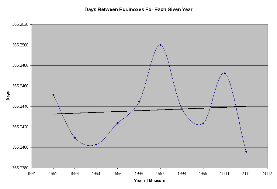 I also plotted the time between Equinoxes of each year. Bottom Line: Nothing is showing anything very definite as far as I can tell. One thing I don't know is - how often is the date on the aa.usno.navy.mil site in these tables updated to reflect actual measurements (if it ever really is) rather than predictions.