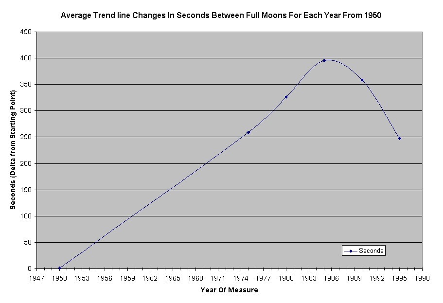 The published date and time (nearest Minute) for Full moons from 1950 to present time (2001) is tabulated by the Navy. Because of the amount of variation in data points from year to year, a large number of points was needed to get a good average and see the current trends.