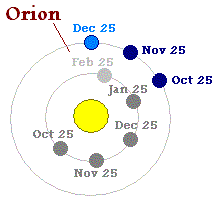 時計が、 2003年11月- 12月のポジションの地球の2004年2月の時計のために日の出に非常に近くすぎる所で人が真夜中の空に注意することができた所にポイントを、おく、回転の遅れの増大は、これを消し、混乱させる。