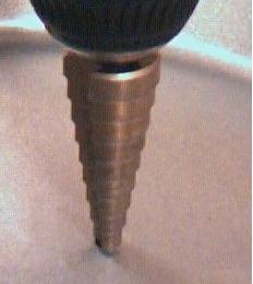 3. Mark center of pie pan and drill a small hole, then larger and larger until it is 7/8”. If .75” is as close as you can drill then use a file or rotary rasp to make it bigger until the copper pipe just fits. See use of step drill bit in in photo at right. Do the same for the pot lid. The step drill bit can be purchased from Harbor Freight tools.