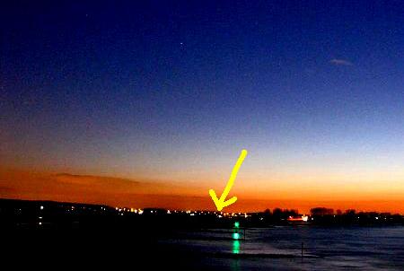 - At first glance this one looks OK. Pixels are uniform with no apparent cut and paste etc. I have adjusted the brightness and contract to bring out an interesting feature, not in the sky but instead on the foreground. See the arrow [at left, below]. The horizon of a citiscape is a straight line like it is cut and paste in. If that is so then the photo has been altered in some way with a fake location.