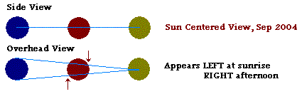 To the left of sun it is pretty apparent with red tail/dust to the left of it also. [and from another source] Photos taken at 5:10 PM Sep 21, 2004. The reverse of what is seen in the northern hemisphere, Planet X is now to the left in the afternoon, the reserse of what was seen last Mar 4, 2004.