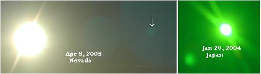 - I had taken Winged Globe pictures in Japan over year ago. At that time the Winged Globe was top left to bottom right. This mornings picture I took the Winged Globe was top right to bottom left. Does this have a significance? [Comparison photos taken by this photographer, 2004 with a lens to reduce Sun's glare, but moon swirl evident in 2005 photo, at arrow, without lens also.]