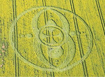 This crop circle represents the wobble, with the variations in the wobble as experienced on various parts of the globe represented where there are differences in the pattern. Where the pattern has consistency in the circle, this represents what would be the normal rotation of the Earth, sans the wobble.