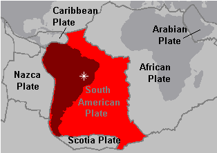 The South American plate is about 1/3 land mass with a convergent plate boundary on the west coast.