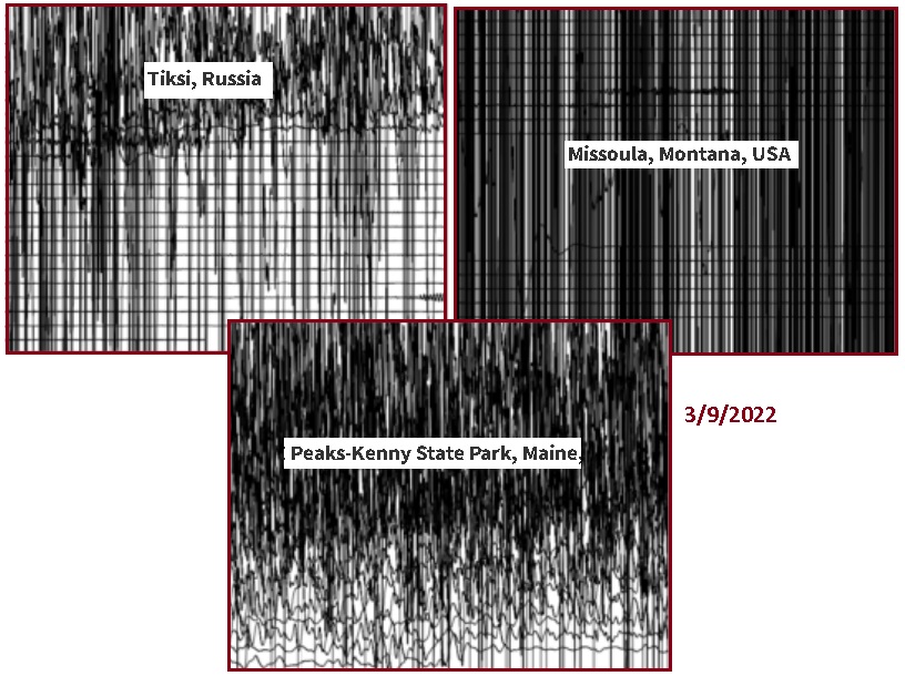 This past week we have seen daily changes in the N America Plate that indicate the New Madrid rupture is in process. On March 5 we saw the Mississippi River being tugged apart, with a black Heliplot in Vicksburg, MS across from a black Heliplot at Mt Ida, AR. By March 8 one could see that from the Seaway to the tip of Mexico, N America was under stress. By March 9 it was clear why Tiksi, Siberia was so often black on the Heliplots but this transferred to Montana. Tiksi is on the plate border, thus tugged, but Montana is directly South of that point.