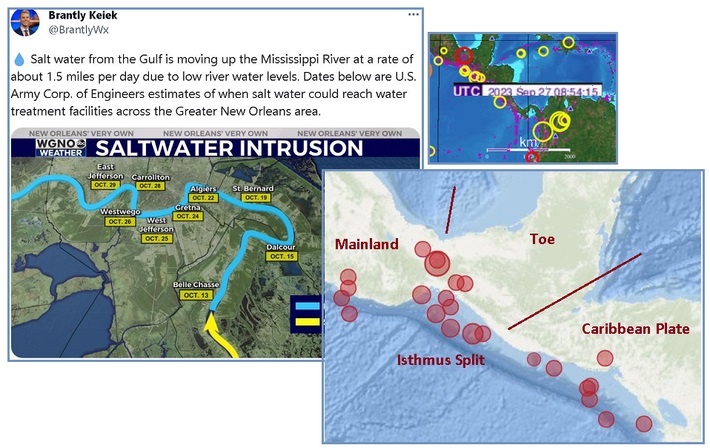 As noted in a prior Newsletter, by September 21 salt water has begun flowing up the Mississippi. Meanwhile on the other side of the world on September 27, booms were heard throughout central China. This video posted on the Jack Straw forum provides the evidence. Booms are due to ripping rock, as it snaps apart.