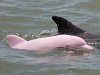 A charter-boat captain from Lake Charles, La., photographed a rare pink dolphin a couple of weeks ago in Calcasieu Lake, an estuary just north of the Gulf of Mexico in southwestern Louisiana. According to Calcasieu Charter Service's Web site, Capt. Erik Rue was on the lake June 24 with fishing customers when five dolphins came into view - four normal-looking gray ones, and a bright pink one that appeared to be an adolescent. "It appears to be an uncanny freak of nature, an albino dolphin, with reddish eyes and glossy pink skin," the Web site reads. "It is small in comparison to the others it is traveling with and appears to be a youngster traveling with mama." There is a species of pink dolphin that lives in the Amazon River in South America, but this one appears to be a more common bottlenose dolphin.
